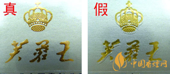 ①開蓋處“芙蓉王”及王冠圖案印刷:真品卷煙燙金定位準(zhǔn)確,套色均勻,凹凸明顯,印刷工藝精細;假冒卷煙燙金定位不準(zhǔn),脫漆脫色嚴(yán)重,印刷工藝粗糙。