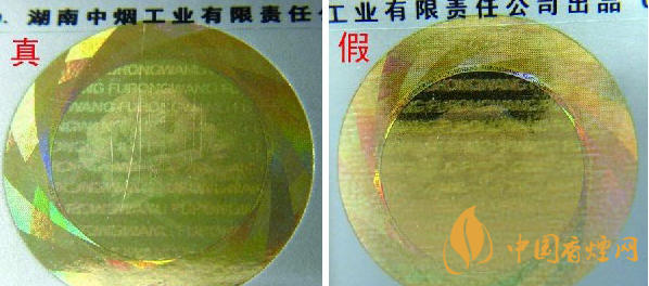 ②迎光觀察激光全息圖案:真品卷煙圖案內(nèi)拼音字母、芙蓉花及“芙蓉王”轉(zhuǎn)換不同角度,都會呈現(xiàn)不同圖案的切換,且層次清晰、字體完整;假冒卷煙無論如何轉(zhuǎn)換角度,都無法達到完美切換,字體模糊,圖案缺失嚴(yán)重。