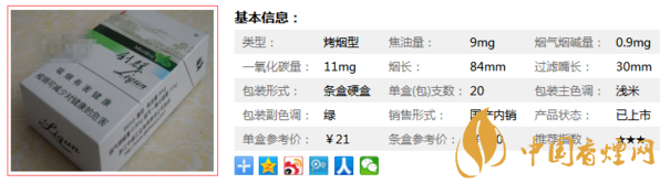 這款煙,焦油量:9mg 煙氣煙堿量:0.9mg 一氧化碳量:11mg 煙長:84mm 過濾嘴:30mm 相對于其他品種的香煙煙草可吸部分較短,但是很耐抽。