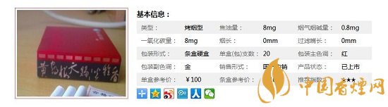 | 類型 :烤煙型 | 焦油量 :8mg | 煙氣煙堿量 :0.8mg | 一氧化碳量 :8mg |