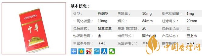 中華硬10mg煙支長84mm,過濾嘴長20mm,土黃色的過濾嘴上打著兩排細(xì)小的靜電孔,很不容易察覺。接近水松紙的下方印著紅色的中英文品名及華表,采用的還是典型的橫紋松紋紙,不過在煙支的末端印著數(shù)字‘118’。下面我們一起來看中華硬10mg的參數(shù)信息:焦油量:10mg. 煙堿量:1mg. 一氧化碳量:10mg.