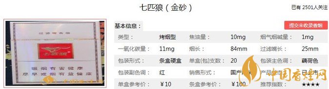 七匹狼金砂煙支長(zhǎng)84mm,過(guò)濾嘴:25mm,這款七匹狼的包裝款式簡(jiǎn)潔大方,煙氣飽滿充足,降焦不夠明顯,但是沒什么香氣,勁道適中,口感比較一般,入口有點(diǎn)雜氣,入喉有點(diǎn)刺激感,感覺沒什么特色,味道平和普通。下面我們一起來(lái)看七匹狼金砂的參數(shù)信息:焦油量:10mg 煙堿量:1mg 一氧化碳量:11mg