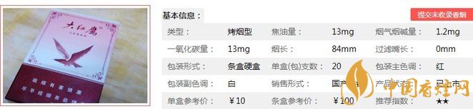 大紅鷹50版煙支長(zhǎng)84mm,阻燃帶長(zhǎng)30mm,過(guò)濾嘴:24mm,煙嘴以淡黃色為主色調(diào),煙嘴整體給人以清新、歡快、向上的感覺(jué)。煙支雪白,煙紙橫紋明顯。煙支的切口比較整齊,煙絲充填比較飽滿。下面我們一起來(lái)看大紅鷹50版的參數(shù)信息:焦油量:13mg 煙堿量:1.2mg 一氧化碳量:13mg