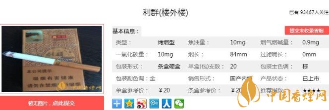 利群(樓外樓)香煙,剛開始推出的時(shí)候,溢價(jià)比較嚴(yán)重。現(xiàn)在價(jià)格回歸正常的水平,拿來當(dāng)口糧真的是沒話說,只是現(xiàn)在煙草投放的量太少,地區(qū)口碑又很好,很多煙民朋友想買都買不到。售價(jià)20 元/盒,還是非常公道的。