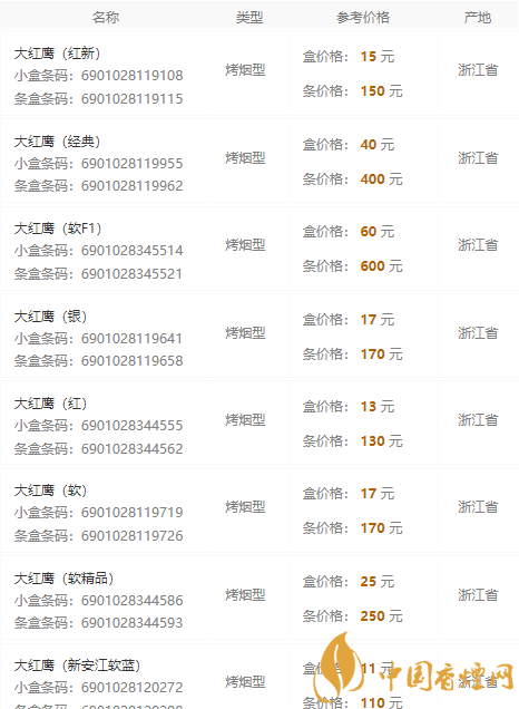 香煙網(wǎng)為您提供2020大紅鷹香煙價(jià)格表和圖片,大紅鷹這個(gè)品牌在浙江是一個(gè)風(fēng)光無(wú)限的品牌,這款香煙在老煙民的眼里都是老牌了,那么,您知道2020大紅鷹香煙價(jià)格嗎?趕緊來(lái)香煙網(wǎng)看看吧!