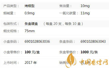 | 類型 :烤煙型 | 焦油量 :10mg | 煙氣煙堿量 :0.9mg | 一氧化碳量 :11mg |