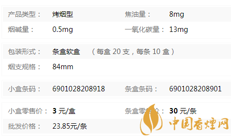 | 煙長:84mm | 過濾嘴長:20mm | 包裝形式:條盒軟盒 | 單盒(包)支數:20 |