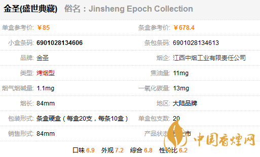 金圣(盛世典藏)煙(俗稱:Jinsheng Epoch Collection)是江西中煙工業(yè)有限責任公司旗下品牌金圣香煙推出的一款焦油含量11mg的烤煙型香煙。下面小編就為大家介紹一下這款香煙,希望大家能夠喜歡。
