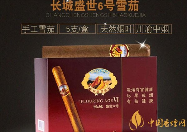 長城雪茄煙盛世6號秉承了長城當盛世5號的包裝色系,主色系采用艷麗的酒紅,輔助副色系為金色,看上去一樣的喜慶的貴氣。長城雪茄煙多少錢一包,接下來香煙網小編將為大家介紹長城雪茄煙價格表和圖片。