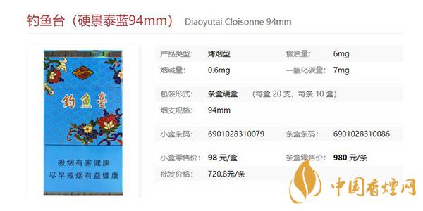 釣魚臺(tái)(硬景泰藍(lán)94mm)售價(jià)為98元/盒。產(chǎn)品風(fēng)格:①由中國釣魚臺(tái)國賓館監(jiān)制,紅云紅河集團(tuán)特制,從內(nèi)到外皆具中國特色。②外觀包裝的設(shè)計(jì)元素來源于中國景泰藍(lán)瓷器,鮮明色彩以及五彩花圖的運(yùn)用,大膽、時(shí)尚、又不失典雅的韻味。③吸味上更加突出典型中國烤煙型卷煙的自然煙草本香,香氣自然、細(xì)膩、雅致,口味醇和,口感舒適。