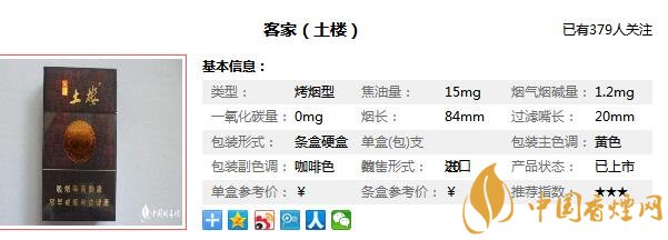 這是一款客家族的香煙,是傳承福建土樓文化的香煙品牌。由永定縣政府和福建中煙公司聯(lián)合開發(fā),傳承福建土樓,弘揚客家永定條絲煙文化,是一款別具風味的香煙,那么在了解客家樓香煙價格表之前,先來看看這款客家樓香煙多少錢一包,這款香煙的售價為40元/包。