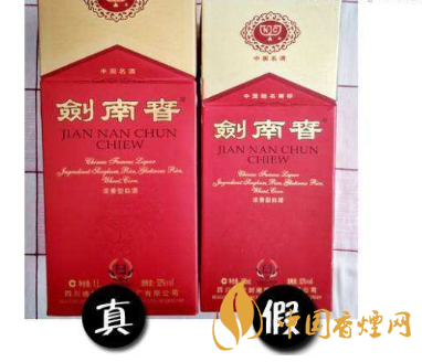 二、重點從商標(biāo)標(biāo)簽上鑒別1、 真品劍南春酒標(biāo)簽主要特征:(1)正標(biāo)標(biāo)簽上“劍南春”三個字,“注冊商標(biāo)標(biāo)識、外花邊”、“jian nan chun chiew”劍南春酒拼音均有凸凹感,印刷套印比較準(zhǔn)確,線條清晰,字體邊緣不毛,輪廓清楚。(2)小字體:酒精度、凈含量、廠名、廠址和簡介,這些字體很清晰、均勻、無斷裂,邊緣顏色協(xié)調(diào)。(3)背標(biāo)標(biāo)簽:背標(biāo)標(biāo)簽鑒別主要從簡介內(nèi)容及印刷字體入手,字體清楚、不毛邊,邊緣顏色協(xié)調(diào)。2、 假冒劍南春酒標(biāo)簽的特點(1) 正標(biāo)標(biāo)簽上凸凹感不明顯;(2)字體套印不準(zhǔn)確,線條不均勻,字體有毛邊和粗細(xì)不勻等現(xiàn)象;(3)小字體不清晰和模糊現(xiàn)象嚴(yán)重;(4)背標(biāo)標(biāo)簽邊緣顏色與背標(biāo)整體不協(xié)調(diào)。
