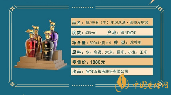 五糧液辛丑(牛)年紀(jì)念酒.四季發(fā)財(cái)裝,瓶蓋 頂立如牛,切割金屬牛以金屬材質(zhì)潛心鑄造四種靈敏聚財(cái)?shù)慕鹋P螒B(tài)!瓶身 金牛頭,采用浮雕工藝,將牛年傳統(tǒng)生肖結(jié)合,鴻運(yùn)當(dāng)頭照,宜賓五糧液有限公司:囍酒!瓶底 電鍍工藝質(zhì)感,細(xì)致浮雕防滑!五糧液辛丑(牛)年紀(jì)念酒.四季發(fā)財(cái)裝京東售價(jià)1880元。