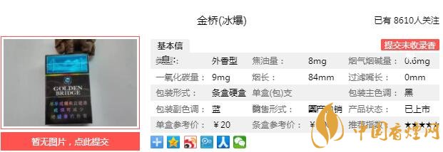 金橋冰爆煙支長(zhǎng)84mm,過濾嘴長(zhǎng)27mm,過濾嘴上有三排降焦孔,細(xì)看煙支切工整齊,煙絲色澤鮮亮。下面我們一起來(lái)看金橋冰爆的參數(shù)信息:焦油量:8mg 煙堿量:0.6mg 一氧化碳量:9mg