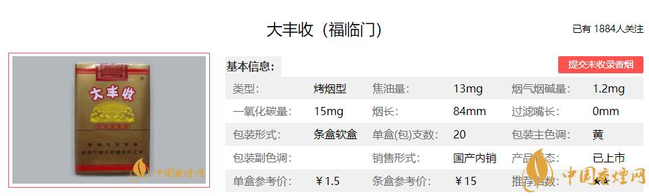 青“大豐收”為中國第一個(gè)卷煙共享品牌,是隸屬于中國煙草總公司的卷煙商標(biāo),制煙工藝經(jīng)典純正,致力于找尋卷煙最原始自然的口感,化繁為簡,不加香精香料,品出煙草本真的味道。下面便是大豐收(福臨門)的基本參數(shù):煙支長度:84mm 焦油量:13mg 煙氣煙堿量:1.2mg 煙氣一氧化碳量:15mg.