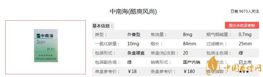 中南海香煙是國(guó)內(nèi)首個(gè)低焦含量的香煙品牌,旗下的香煙品種很多,不僅用于內(nèi)銷(xiāo),很多香煙還對(duì)外出口,是國(guó)內(nèi)目前最為暢銷(xiāo)的香煙品牌之一。中南??崴L(fēng)尚屬于典型的外香型香煙,外觀清新淡雅,突出與口感結(jié)合的清涼之意。