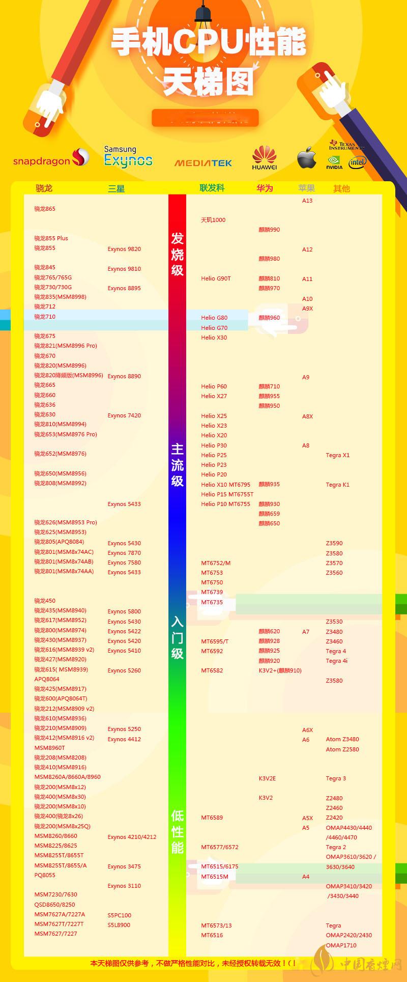 注:手機(jī)CPU天梯圖僅供參考,參照點(diǎn)不同,排名會有差異,這也是不同平臺的天梯圖存在差異的原因。