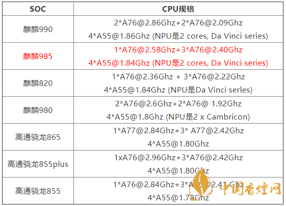 從規(guī)格來看,麒麟985定位于麒麟820、麒麟9905g之間, 采用1個(gè)a76 (2.58ghz) +3個(gè)a76(2.4ghz)+4個(gè)a55 (1.84ghz) , 搭載雙核達(dá)芬奇npu。同時(shí)集成八核心mali-g77gpu,以及麒麟990同款的雙核心npuai單元、isp5.0圖像 單元。