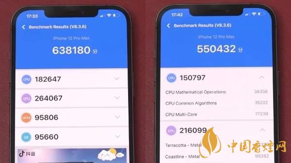 隨后我們在iPhone 12 Pro Max上又進(jìn)行了一次安兔兔跑分測試,從初始的638180分下降到550432分,從跑分成績來看只有原來性能的86%。