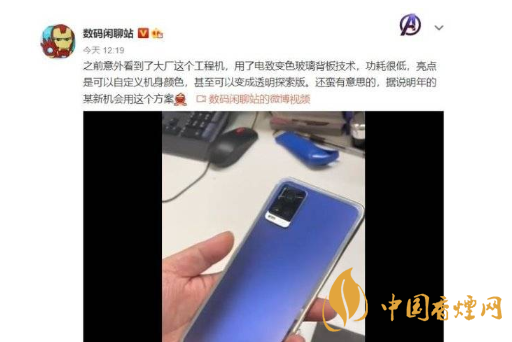 數(shù)碼博主數(shù)碼閑聊站在微博展示了一款可以進行機身自定義變色的手機。并表示這款新機采用了電致變色玻璃背板技術(shù),功耗很低,亮點是可以自定義機身顏色,甚至可以變成透明探索版。