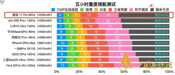 這次測評主要通過對720P在線視頻、刷微博,抖音,打王者榮耀和平精英等日常應用進行測試,得出了5G旗艦的五小時重度續(xù)航排名。其中,續(xù)航最好的機型是魅族17 Pro,經過五小時的重度測試,該機還剩下45%的電量。