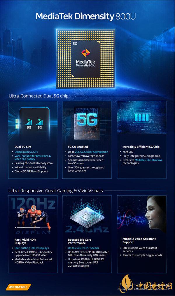 天璣800U支持120Hz刷新率FHD+屏幕、HDR10+、聯(lián)發(fā)科定制的MiraVision PQ引擎、6400萬像素或四攝。