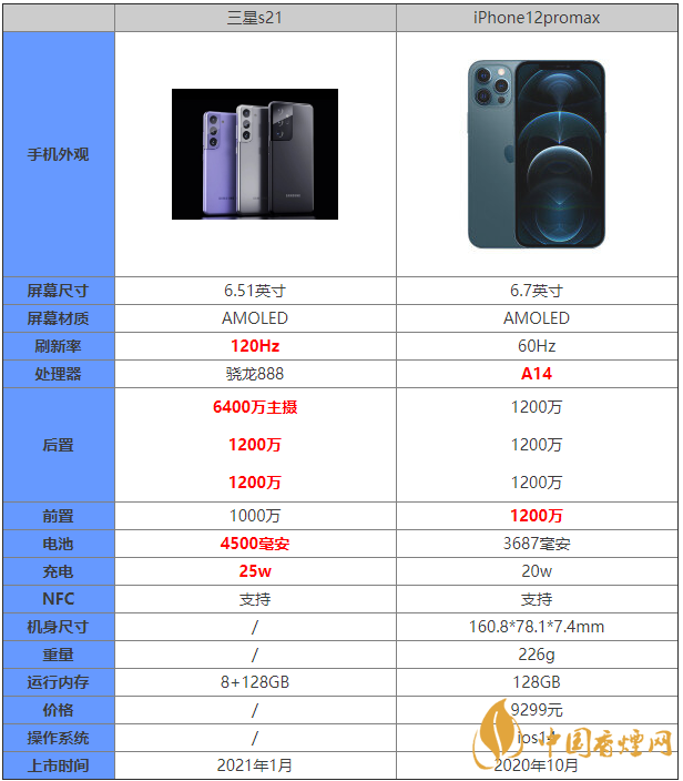 三星s21是一款即將發(fā)布的新款手機(jī),許多小伙伴對(duì)這款手機(jī)一直十分關(guān)注,那么對(duì)比蘋果12promax這款手機(jī)有什么區(qū)別?哪款手機(jī)更值得入手?下面香煙網(wǎng)小編將對(duì)三星s21和蘋果12promax的參數(shù)對(duì)比進(jìn)行介紹,感興趣的朋友一起來看看吧!
