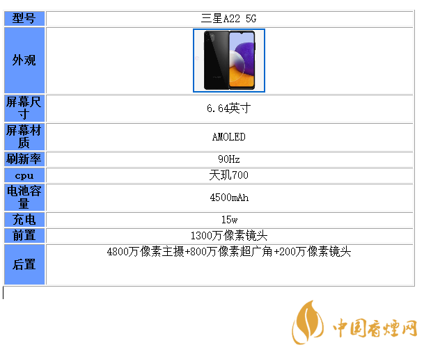 以上就是小編收集到的三星A22 5G參數配置詳情-三星A22 5G性能分析的相關內容,以上內容均來源于網絡,僅供參考,一切以實際為準,更多最新數碼資訊請關注香煙網。