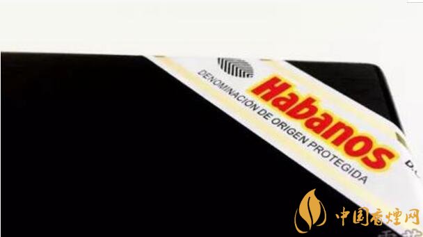 紅色粗體的“Habanos”被黃色描邊加亮,左邊是黑色條紋的煙草葉圖案,頂端和底部是二條金色的粗線條,在標簽底部印有DENMOINACION DE ORIGEN PROTEGIDA字樣,代表受保護的原產地名稱。在標簽的右上角還有一個D.O.P.,是原產地保護的縮寫。這個標簽應該是最不容易被忽略的Habanos標志了。