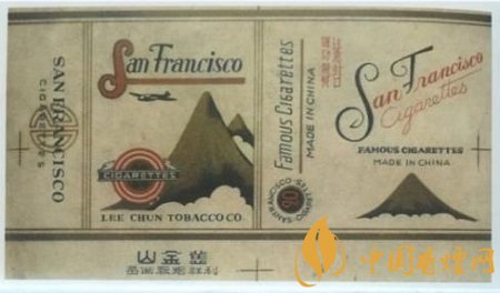 上世紀三十年代,由利群煙廠出品的“舊金山”牌卷煙,為橫版。煙標上由紅色大寫英文字母“S”帶出的“San Francisco”品名,舞動感十足。其下兩座金山上,一架飛機翔過,山腳旁畫有三個重疊的紅色圓圈,一圈一圈又一圈,像極了煙蒂的火苗生生不息,在此中間寫有“CIGARETTES”,別出心裁地交代了“舊金山”牌卷煙的品質和規(guī)格。副版的文字多于圖案,草寫的英文煙標,重復豎寫橫寫的“Famous cigarette”,左上角“注意封口、謹防假冒”八個中文字的提示,卻很醒目。當時的煙標設計,以提示的文字顯現,確不多見。整張煙標幾乎鋪滿了“舊金山”牌卷煙所要表達的內容。