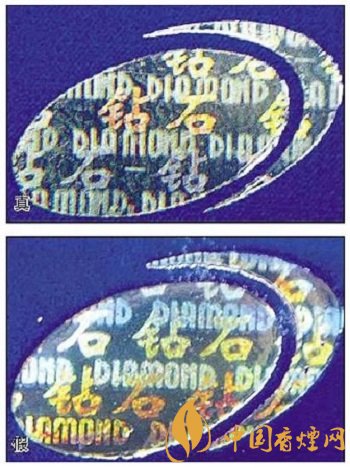 真煙鉆石圖案印刷清晰,色彩感強,內(nèi)有微縮英文字母“DIAMOND”,圖案無凹凸感;假煙印刷不清晰,用手摸上去有凹凸感。