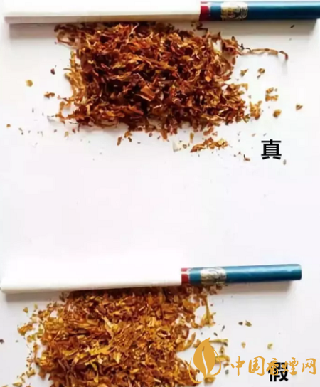 真品卷煙的煙絲由葉絲組成,煙絲切絲均勻,光澤油潤(rùn)性好,碎末少,顏色為檸檬黃;假冒卷煙的煙絲由碎梗、碎絲組成,工藝粗糙,煙絲寬度不均勻、多為碎末,經(jīng)硫磺熏制后呈黃白色。