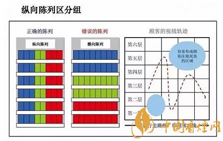 縱向陳列較橫向陳列更符合顧客視線軌跡的運(yùn)行,能最大限度地提升顧客對(duì)排面的關(guān)注,避免顧客視線死角的形成。如下圖: