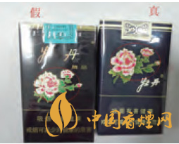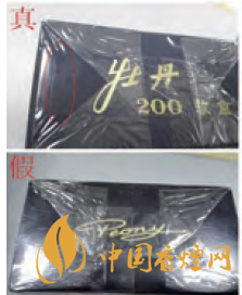 正面商標(biāo)紙差異對(duì)比:真品卷煙采用絨面印刷工藝,花形悉心勾勒,更顯質(zhì)感,圖案“牡丹花”更為寫實(shí)。假冒偽劣“牡丹(軟藍(lán))”多以舊版“牡丹花”造型進(jìn)行模仿,其圖案與真品存在明顯差異。
