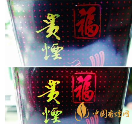 商標紙印刷工藝差異對比:真品小盒正面商標紙“貴煙”燙金由無數的網格狀組合而成;假煙小盒正面商標紙“貴煙”字體普通仿造印刷而成,與真品商標紙印刷工藝存在明顯差異。