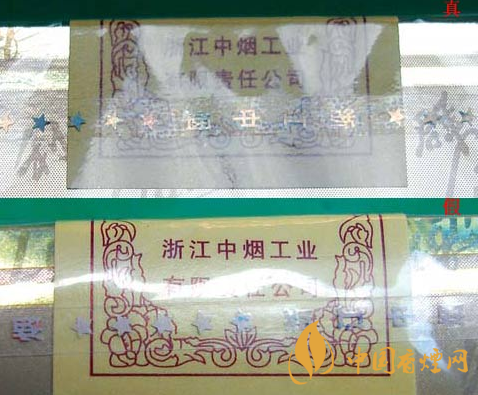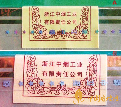 看商標紙印刷方式:真煙的商標紙印刷方式為凹印與膠印相結(jié)合,黃色筆劃邊緣呈鋸齒狀、黑色筆劃邊緣光滑。假煙的商標紙印刷方式皆為膠印,字體筆劃邊緣都光滑。