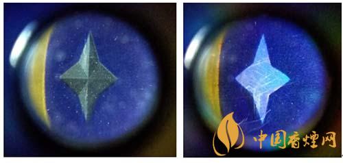 (3)真品卷煙商標(biāo)LOGO處“星”,側(cè)光觀察立體感強(qiáng),中間凸邊緣平,呈錐形,棱角明顯。