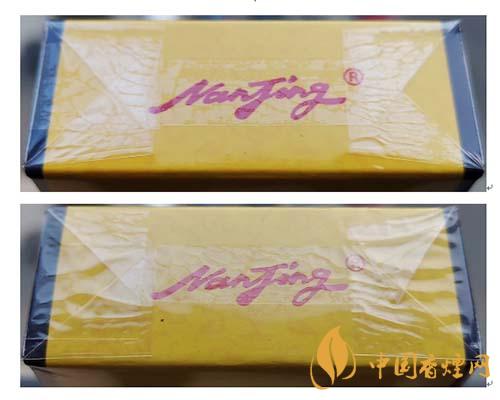 假冒卷煙:該款假冒卷煙南京字體邊緣金色輪廓線和筆畫內(nèi)無小圓點(diǎn),字體筆畫顏色暗淡,燙金套印有偏差。圖3上真下假