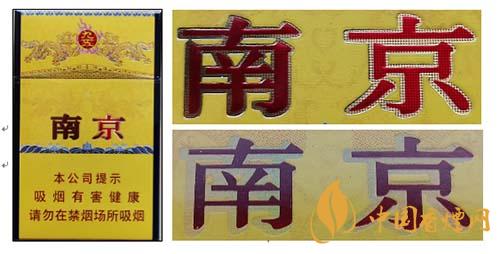真品卷煙:南京字體邊緣金色輪廓線和筆畫由小圓點(diǎn)組成,側(cè)光觀察感覺為網(wǎng)格狀痕跡。