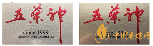 真品卷煙:“五葉神”字體筆畫流暢自然,套印準(zhǔn)確,筆畫基本無凸起,字體筆畫顏色為鮮紅。