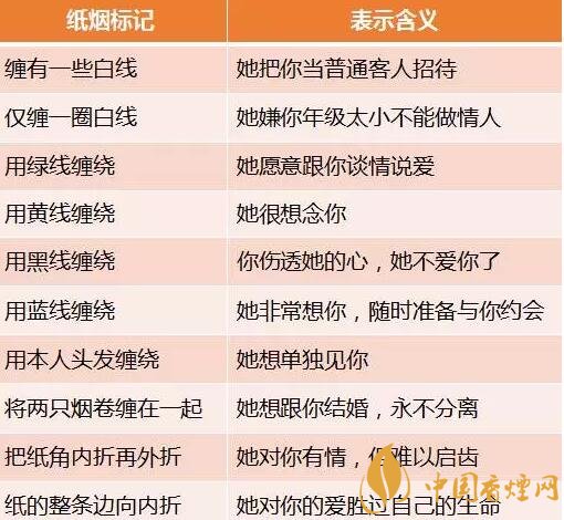 在緬甸的迪登地區(qū),女子接受或謝絕男子求愛,不是用語言表明,而流行遞上一支標(biāo)有特定符號的紙煙來暗示,不同的符號代表不同的情況: